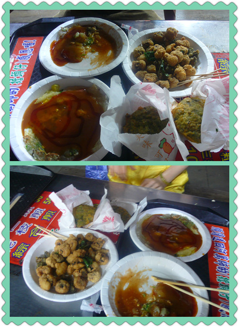 我們選擇阿萬師,點了蚵仔煎、蚵仔酥,到另一攤位買蚵嗲。