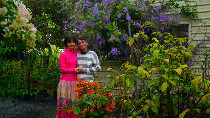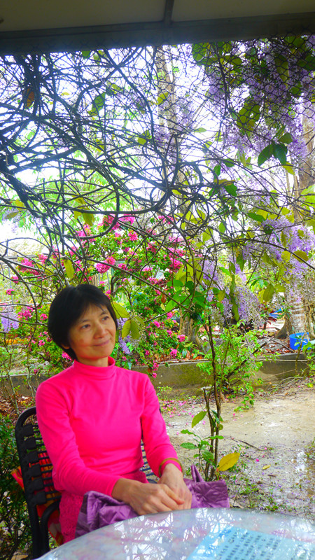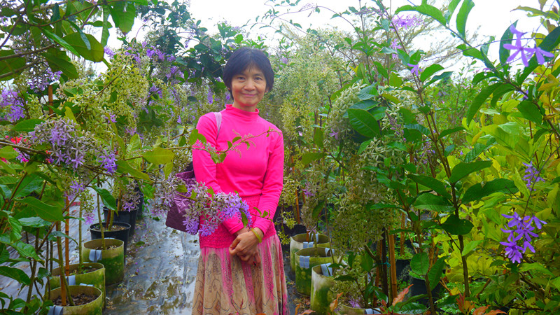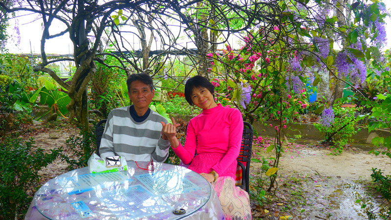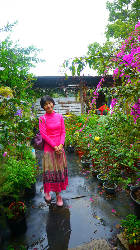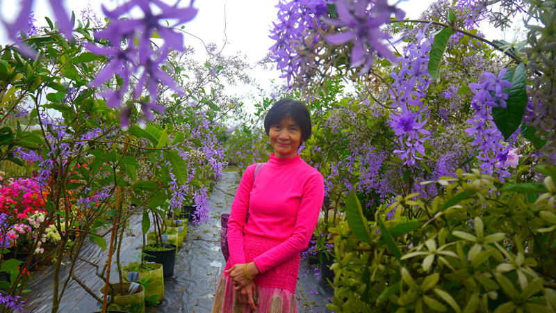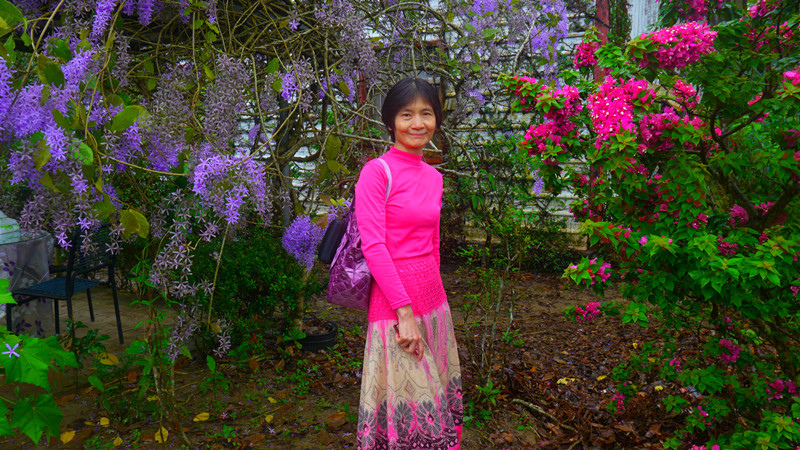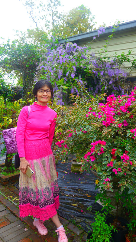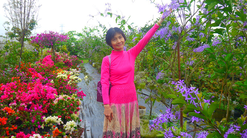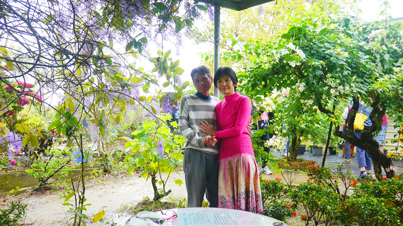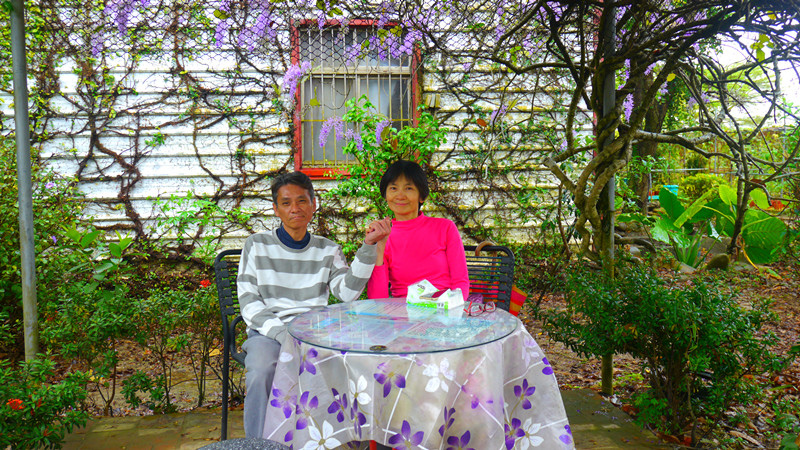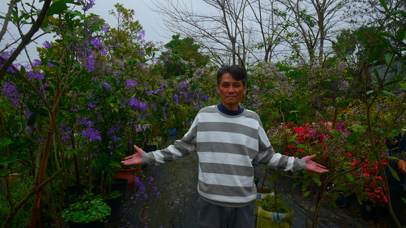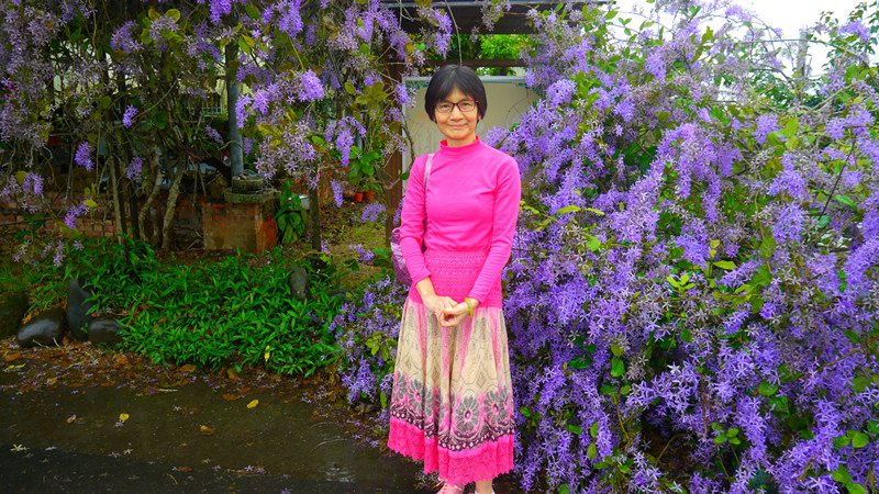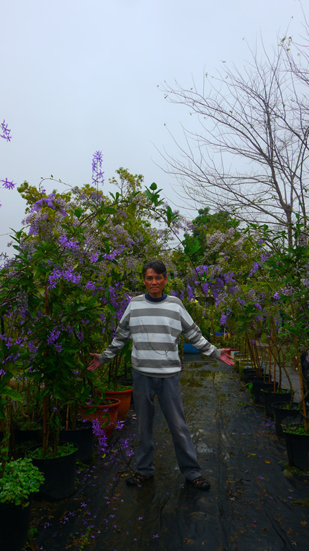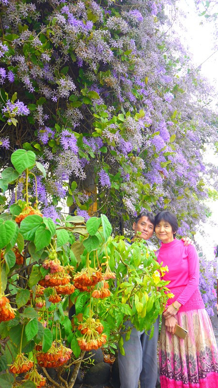 這天飄點小雨,來到雙秀園,還好道路寬闊平坦好停車,就位於玉井的台三線路邊;門口這株招牌錫葉藤,是20年前老闆夫妻從彰化田尾買回來種植,種著種著越來越茂盛,每到花季,一片紫色花牆非常壯觀。